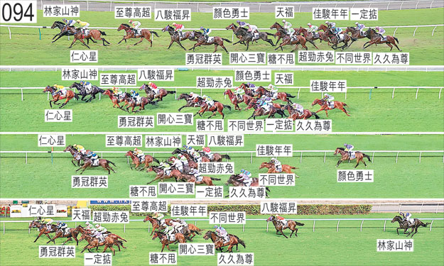 「仁心星」賽後須抽取樣本檢驗。 「不同世界」起步後不久在「八駿福昇」與「至尊高超」之間的窄位競跑。 「勇冠群英」巴度因違反賽事規例第100(3)(ii)(f)條而被罰款五千元,事緣他於末段用鞭時兩度將握鞭的手抬高於肩部水平。大部分途程走外疊,沒有遮擋。賽後須抽取樣本檢驗。 「八駿福昇」賽後,蔡明紹未能為坐騎令人失望的表現提供解釋。賽後立即接受獸醫檢查,並無發現任何明顯異常之處。 「糖不甩」起步時向外斜跑,被碰撞。潘明輝(「天福」)承認一項不小心策騎〔賽事規例第100(1)條〕,事緣他於末段在空位不足下將坐騎移至「勇冠群英」外側,導致「天福」與「超勁赤兔」互相觸碰,並將該駒帶至橫越「糖不甩」的跑線,「糖不甩」因而勒避。小組判罰潘明輝由十一月二日星期日開始停賽,直至十一月六日星期四才可再次出賽(兩個香港賽馬日)。在衡量判罰輕重時,小組裁定潘明輝的不小心策騎程度屬第二級,以及影響情況屬第二級,也考慮了他的良好策騎出賽紀錄。賽後,梁家俊報告,由於坐騎於末段受到干擾,他未能力策坐騎至終點。 「天福」跑離八百米處時收慢避開「顏色勇士」。跑了一段短途程後向外斜跑,與「超勁赤兔」互相觸碰。轉直路彎時及直路早段受困。潘明輝因於末段造成干擾而承認一項不小心策騎(見「糖不甩」)。 「開心三寶」中段搶口。趨近九百米處時收慢避開「八駿福昇」。末段在「超勁赤兔」被「天福」帶向外跑時收慢避開「超勁赤兔」。賽後須抽取樣本檢驗。 「一定掂」躍出時觸碰閘廂左側及失地。其後在「顏色勇士」與「超勁赤兔」之間受擠迫。 「佳駿年年」出閘僅屬一般。賽後立即接受獸醫檢查,並無發現任何明顯異常之處。 「超勁赤兔」出閘笨拙,其後不久受躍出時向外斜跑的「糖不甩」擠迫。接近七百米處時發生碰撞。宣佈覆磅完畢前,小組曾考慮是否有理據代表於末段被「天福」帶出較外疊的第五名馬匹「超勁赤兔」提出抗議。小組認為沒有充足理據提出抗議,而馬主及練馬師也決定不提出抗議,小組遂宣佈覆磅完畢及確定評判員宣佈的名次。 「顏色勇士」「顏色勇士」包尾大敗而回,小組認為此駒的表現難以接受。「顏色勇士」必須試閘及格,並且通過獸醫檢驗後,才可再次出賽。賽後立即接受獸醫檢查,並無發現任何明顯異常之處。