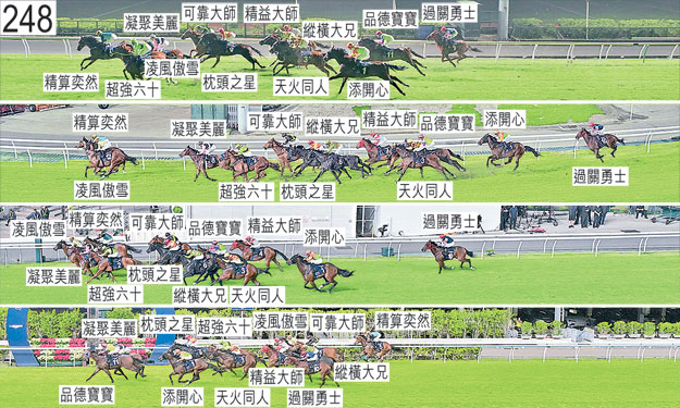 「超強六十」起步後不久向內斜跑,被碰撞。接近二百五十米處時向內斜跑,與「凝聚美麗」互相輕微觸碰。賽後須抽取樣本檢驗。 「天火同人」起步後不久受擠迫。 「精益大師」起步後不久向外斜跑,被碰撞。末段在「超強六十」之後受困之際未能被力策。 「精算奕然」布文表示,坐騎在領放下受「凌風傲雪」追迫而不利發揮,因而在直路上衝刺乏力。賽後立即接受獸醫檢查,並無發現任何明顯異常之處。 「縱橫大兄」接近一百五十米處時在開始墮退之際內閃,收慢避開略為向外斜跑的「品德寶寶」。 「可靠大師」起步後不久發生碰撞。最後二百米受困而未能望空,未能被力策至終點。 「凝聚美麗」起步後不久向外斜跑,被碰撞。接近二百五十米處時發生碰撞。宣佈覆磅完畢前,小組曾考慮是否有理據以「凝聚美麗」與「品德寶寶」於趨近終點時互相觸碰為理由,抗議「品德寶寶」的頭馬資格。考慮到「品德寶寶」於末段衝刺時的走勢,以及此次觸碰是因兩駒雙雙斜跑所致,而儘管「品德寶寶」進一步斜跑,但小組仍認為抗議的理據不足,因此宣佈覆磅完畢及確定評判員宣佈的名次。賽後須抽取樣本檢驗。 「過關勇士」出閘僅屬一般。被查詢時,莫雅表示,坐騎於早段居於「品德寶寶」外側,他須於坐騎在窄位競跑時將坐騎向內移入至該駒之後。他說,坐騎沿途內閃,他將此歸因於坐騎經驗仍然相對較淺。他又說,他須於中段沿途催策坐騎以保持居於馬群後列,其後於進入直路時開始將坐騎向外移出以望空。他說,坐騎在直路上內閃,影響了他嘗試這樣做的能力,他因而須於趨近一百米處坐騎開始以勁勢衝刺時在一段短途程上減弱催策力度,以確保能夠將坐騎移至墮退的「縱橫大兄」外側。他進一步表示,坐騎望空後隨即在他手足並用催策下以佳勢衝刺。賽後立即接受獸醫檢查,並無發現任何明顯異常之處。 「品德寶寶」末段內閃,趨近終點時與「凝聚美麗」互相觸碰。賽後須抽取樣本檢驗。 「凌風傲雪」躍出時在「天火同人」與「超強六十」之間受擠迫,當時「天火同人」被「凝聚美麗」帶向外跑,而「超強六十」則向內斜跑。