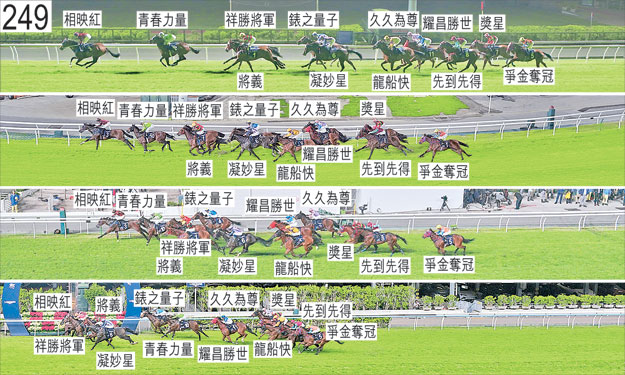 「久久為尊」自外檔出閘後於早段在馬群之後切入。賽後立即接受獸醫檢查,發現此駒流鼻血。「久久為尊」必須試閘及格,並且通過獸醫檢驗後,才可再次出賽。 「相映紅」賽後須抽取樣本檢驗。 「錶之量子」出閘僅屬一般,其後不久與向內斜跑的「耀昌勝世」互相觸碰。 「爭金奪冠」自大外檔出閘後於早段在馬群之後切入。 「先到先得」躍出時向內斜跑,與「耀昌勝世」互相觸碰,因而在略為向外斜跑的「耀昌勝世」外側緊迫競跑。李慕華報告,賽前打算讓坐騎佔取前列位置,但坐騎於起步時受阻礙,因而居於較賽前部署為後的位置。 「龍船快」大部分途程在沒有遮擋下走外疊。 「青春力量」中段在收慢以佔取「相映紅」外側的位置之際搶口。 「耀昌勝世」起步時發生碰撞,向內斜跑,與「錶之量子」互相觸碰。 「祥勝將軍」出閘僅屬一般。賽後須抽取樣本檢驗。
