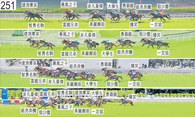 「非凡豪傑」躍出時發生碰撞。被查詢有關他於末段的騎法時,潘頓表示,坐騎在直路上內閃。他說,趨近終點時,他聽到居坐騎內側馬匹的騎師呼喊,因為他擔心坐騎正向內斜跑,擠迫居其內側的馬匹,因而望向內側,停止催策及修正坐騎。賽後須抽取樣本檢驗。 「銀亮奔騰」賽後須抽取樣本檢驗。 「勇霸龍」躍出時觸碰閘廂左側,其後不久向外斜跑,與「非凡豪傑」互相觸碰。賽後立即接受獸醫檢查,並無發現任何明顯異常之處。 「暴風之子」躍出時發生碰撞。二百五十米處至一百五十米處之間在「智勇名駒」與「建測羣英」之間受困而未能望空。 「勁沙塵」自外檔出閘笨拙,向內斜跑,與「暴風之子」互相觸碰。早段在馬群之後切入。 「爆笑」起步時發生碰撞。接近九百米處時在走勢欠順及收慢以在「大學生」之後取得遮擋之際昂首。布宜學報告,他獲指示讓坐騎佔取中間位置。他說,坐騎自六百米處起受催策,其後墮退。 「建測羣英」中段在領放下搶口,趨近一千米處時在收慢之際昂首。 「富國兄弟」杜苑欣於過終點時在坐騎向著內側的「智勇名駒」斜跑之際須停止催策及修正坐騎。 「大學生」最後五十米在「美麗邂逅」與「暴風之子」之間受困之際未能被力策。巴米高報告,坐騎沿途內閃,直路上難以被力策。賽後立即接受獸醫檢查,並無發現任何明顯異常之處。 「一定掂」自外檔出閘笨拙,向外斜跑,碰撞「爆笑」,早段在馬群之後切入。 「美麗邂逅」賽後立即接受獸醫檢查,並無發現任何明顯異常之處。