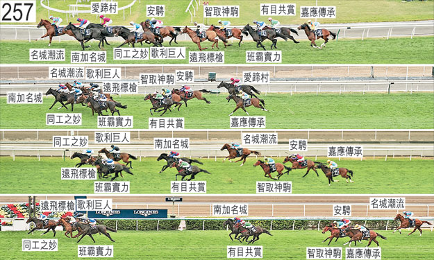 「班霸實力」出閘僅屬一般。接近一百米處時向內斜跑,與「遠飛標槍」互相輕微觸碰。 「遠飛標槍」接近一百米處時發生碰撞。賽後被發現失去左前蹄的蹄鐵。賽後須抽取樣本檢驗。 「歌利巨人」接近四百米處時一度受困。 「同工之妙」賽後須抽取樣本檢驗。 「名城潮流」早段搶口。接近二千一百米處時在一段途程上收慢避開「遠飛標槍」。李慕華報告,坐騎於早段及中段沿途太過搶口,因而他自千八米處起在坐騎走外疊時須讓坐騎展步上前以免多走腳程。他說,坐騎因於早段及中段沿途的走勢而在直路上未能以勁勢衝刺。賽後立即接受獸醫檢查,並無發現任何明顯異常之處。 「愛蹄村」莫艾誠報告,坐騎於早段走勢暢順。他說,「名城潮流」於接近千一米處時推進至坐騎外側,坐騎其後走勢欠佳,直路上墮退。賽後立即接受獸醫檢查,並無發現任何明顯異常之處。 「智取神駒」跑了一段短途程後在收慢以讓「歌利巨人」過頭之際昂首及失去平衡。早段搶口,接近千七米處時在一段途程上收慢避開「歌利巨人」。布文表示,他獲指示是日讓坐騎更為留後競跑,以嘗試使坐騎在二千四百米途程上交出好表現。練馬師沈集成確認所發出的指示。 「有目共賞」出閘笨拙。跑了一段短途程後在收慢以讓「遠飛標槍」過頭之際失去平衡。 「嘉應傳承」自大外檔出閘後於早段在馬群之後切入。