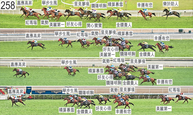 「嘉應高昇」賽後須抽取樣本檢驗。 「里見夢境」出閘笨拙,向外斜跑,與「精算暴雪」互相觸碰。 「金鑽貴人」出閘僅屬一般。 「紅瑪瑙」三浦皇成因於接近二百五十米處時對坐騎連續用鞭兩次而被譴責。賽後立即接受獸醫檢查,並無發現任何明顯異常之處。 「樂於助人」被查詢時,莫艾誠表示,坐騎於躍出時急促向外斜跑,導致腳踏皮帶的皮扣鬆脫。他說,這導致他須將右腳移離腳踏,並在未能使用腳踏下完成餘下途程。 「幸運有您」自外檔出閘後於早段在馬群之後切入。 「美麗第一」接近九百米處時搶口,在收慢讓「紅瑪瑙」(三浦皇成)過頭之際昂首。小組告誡三浦皇成須加倍小心,並須確保給予內側馬匹充足的競賽空間。此駒其後在沒有遮擋下走外疊。接近二百五十米處時開始墮退,在「好友心得」與向外斜跑的「精算暴雪」之間一度受擠迫之際收慢。 「精算暴雪」起步時被碰撞後軀。賽後須抽取樣本檢驗。 「好友心得」直路上內閃。接近一百五十米處時收慢避開向外移出的「精算暴雪」(艾道拿)。小組告誡艾道拿須加倍小心。賽後立即接受獸醫檢查,並無發現任何明顯異常之處。 「開心寶寶」出閘僅屬一般。杜苑欣報告,坐騎於中段開始墮退,她於接近六百米處時擔心坐騎有不妥,因而在餘下途程上未有繼續催策坐騎。賽後立即接受獸醫檢查,發現此駒的右後腿不良於行。包尾大敗而回,小組認為此駒的表現難以接受。「開心寶寶」必須試閘及格,並且通過必須包括額外診斷評估的獸醫檢驗後,才可再次出賽。