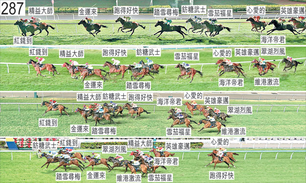 「鈁糖武士」賽後須抽取樣本檢驗。 「維港激流」自外檔出閘後於早段在馬群之後切入。最後一百米內閃,難以被力策至終點。 「踏雪尋梅」起步時向內斜跑,與「雪茄福星」互相觸碰。直路上內閃,難以被力策。賽後須抽取樣本檢驗。 「跑得好快」賽後立即接受獸醫檢查,並無發現任何明顯異常之處。 「翠湖烈風」自大外檔出閘後於早段在馬群之後切入。接近二百米處時在移至「海洋帝君」內側以繼續望空之際與「英雄豪邁」互相觸碰。末段收慢,移至「金運來」外側以繼續望空。 「心愛的」出閘僅屬一般。賽後立即接受獸醫檢查,並無發現任何明顯異常之處。 「紅錢到」被查詢時,潘頓表示,策騎指示是根據坐騎的慣常競跑模式讓坐騎領放。他說,坐騎出閘迅速,於早段佔取「精益大師」外側的位置,他預期該駒未能展現較坐騎為快的前速,坐騎因而可以超越該駒。他說,「精益大師」在進入對面直路時持續在坐騎內側保持位置,他選擇容許坐騎展步上前超越該駒,因為他認為若嘗試約束坐騎,坐騎會開始搶口,也因為坐騎在陣上傾向外閃。他又說,坐騎因而在中段沿途以較他所願為快的步速領放。練馬師呂健威確認所發出的策騎指示,並同意潘頓的看法,即此駒在受約束之際傾向搶口及外閃。賽後須抽取樣本檢驗。 「英雄豪邁」自外檔出閘後於早段在馬群之後切入。早段搶口,接近一千米處時在一段途程上收慢避開「海洋帝君」。接近二百米處時被向內斜跑的「翠湖烈風」碰撞。 「金運來」末段在「鈁糖武士」與內閃的「踏雪尋梅」之間緊迫競跑。 「雪茄福星」躍出時在受「踏雪尋梅」擠迫之際與「海洋帝君」互相大力觸碰。 「海洋帝君」躍出時在被「雪茄福星」大力碰撞之際失去平衡。