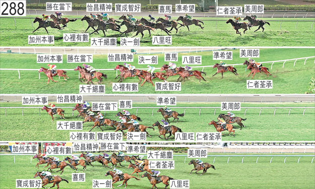 「仁者荃承」出閘笨拙及失地。自外檔出閘後於早段在馬群之後切入。 「決一劍」接近二百米處時受阻礙及被向外斜跑的「寶成智好」帶出更外疊。霍宏聲表示,他賽前部署是讓坐騎佔取前列位置。他說,坐騎於早段走外疊,他嘗試讓坐騎取得遮擋。他說,接近六百米處時「大千絕塵」切入第二疊,導致坐騎須在沒有遮擋下走外疊。 「加州本事」賽後須抽取樣本檢驗。 「寶成智好」接近三百米處時收慢,移至「心裡有數」外側以望空。直路上外閃,接近二百米處時急促向外斜跑,導致騎師鍾易禮須停止催策坐騎及修正坐騎。最後一百米在繼續外閃之際向外斜跑。賽後須抽取樣本檢驗。 「準希望」出閘僅屬一般,其後受出閘笨拙及急促向內斜跑的「心裡有數」擠迫。接近五十米處時在開始衝刺良佳時在「怡昌精神」與「勝在當下」之間未能望空之際收慢,因而未能被力策至終點。 「勝在當下」出閘僅屬一般,其後受出閘笨拙急促及向內斜跑的「心裡有數」擠迫。 「美周郎」自大外檔出閘後於早段在馬群之後切入。 「八里旺」起步後不久在「喜馬」與「加州本事」之間的窄位競跑之際收慢,當時「喜馬」被「大千絕塵」帶向外跑,而「加州本事」則略為向內斜跑。接近二百米處時受阻礙及被「決一劍」帶出更外疊。楊明綸表示,早段及中段步速較標準時間快,不利坐騎發揮,導致坐騎早段走勢欠順。賽後立即接受獸醫檢查,發現此駒患有「喘鳴症」,而此駒過往也有此毛病報告。 「喜馬」起步時發生碰撞。 「心裡有數」出閘笨拙,急促向內斜跑,因而失去平衡。 「大千絕塵」起步時向外斜跑及被碰撞。艾兆禮未能就坐騎令人失望的表現提供任何解釋。練馬師黎昭昇告知小組,此駒在是賽前的表現令他滿意,他能為此駒令人失望的表現所提供的唯一解釋是此駒早段走外疊而不利發揮。賽後立即接受獸醫檢查,並無發現任何明顯異常之處。