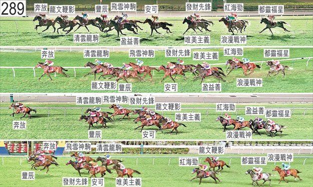 「浪漫戰神」躍出時發生碰撞。布文表示,馬主及練馬師同意此駒自外檔出閘後應於早段留後競跑。他說,坐騎陣上過於搶口,因而在直路上未能以勁勢衝刺。賽後立即接受獸醫檢查,並無發現任何明顯異常之處。 「龍文鞭影」班德禮報告,坐騎於陣上居「奔放」外側走勢暢順,在直路上受催策時未能加速。賽後立即接受獸醫檢查,並無發現任何明顯異常之處。 「奔放」賽後須抽取樣本檢驗。 「飛雪神駒」出閘笨拙。跑過終點後右前腿受傷,立即接受獸醫治療。獲診斷傷勢過於嚴重而未能救治,其後作人道處理。被抽取樣本檢驗。 「都靈福星」自大外檔出閘後於早段在馬群之後切入。 「紅海勁」躍出時發生碰撞。 「盈益善」希威森表示,坐騎大部分途程須在沒有遮擋下走外疊,因而在直路上未能追前。賽後立即接受獸醫檢查,並無發現任何明顯異常之處。 「發財先鋒」出閘緩慢。接近九百米處時收慢避開「飛雪神駒」。趨近五十米處時移至「豐辰」外側以繼續望空。 「豐辰」賽後須抽取樣本檢驗。