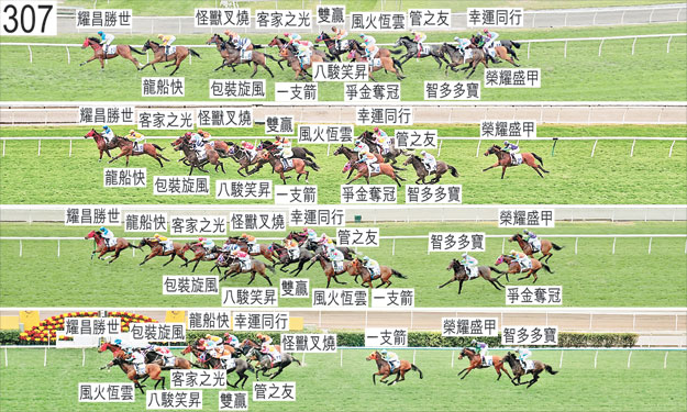 「智多多寶」自外檔起步時發生碰撞。早段在馬群之後切入。早段及中段沿途搶口。潘頓表示,坐騎在直路上欠缺集中力,接近四百米處時在不願移至「爭金奪冠」外側之際及於接近二百米處時在不願移至「一支箭」外側之際難以被力策,他將此歸因於坐騎是日除去頭罩上陣。賽後立即接受獸醫檢查,並無發現任何明顯異常之處。 「雙贏」出閘僅屬一般。二百米處至一百五十米處之間受困而未能望空,跑離一百五十米處時向外移出以望空。賽後須抽取樣本檢驗。 「一支箭」紀仁安表示,坐騎大部分途程在沒有遮擋下走外疊,不利發揮,因而在直路上難以以勁勢衝刺。賽後立即接受獸醫檢查,並無發現任何明顯異常之處。 「爭金奪冠」出閘笨拙。奧爾民對坐騎在直路上的動作有疑慮。賽後立即接受獸醫檢查,發現此駒左前腿不良於行。「爭金奪冠」必須通過獸醫檢驗後,才可再次出賽。 「客家之光」趨近四百米處時在「龍船快」之後受困,其後移至該駒外側以望空,並於這樣做時與「包裝旋風」互相觸碰。 「包裝旋風」接近四百米處時發生碰撞。末段發生輕微碰撞。 「八駿笑昇」直路上在催策下內閃,末段與「包裝旋風」互相輕微觸碰。 「怪獸叉燒」最後一百米受困而未能望空,未能被力策至終點。 「榮耀盛甲」出閘笨拙,向外斜跑,與「智多多寶」互相觸碰。接近九百米處時在勒避「風火恆雲」之際失去平衡。梁家俊報告,策騎指示是於早段讓坐騎留後競跑。賽後立即接受獸醫檢查,並無發現任何明顯異常之處。 「管之友」出閘緩慢。接近二百米處時在「怪獸叉燒」與「雙贏」之間推進之際收慢避開「怪獸叉燒」。趨近一百米處時在一段途程上難以望空。 「風火恆雲」早段在收慢以取得遮擋之際搶口。賽後須抽取樣本檢驗。 「耀昌勝世」賽後須抽取樣本檢驗。 「幸運同行」自大外檔出閘後於早段在馬群之後切入。