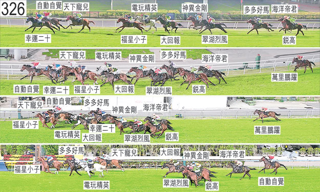 「幸運二十」起步後不久向外斜跑,被碰撞,因而失去平衡。見習騎師黃智弘報告,他在直路上催策坐騎時對牠的動作有疑慮,因而在坐騎處於不具競爭力的位置時收慢坐騎。賽後立即接受獸醫檢查,並無發現任何明顯異常之處。「幸運二十」必須通過獸醫檢驗後,才可再次出賽。 「神異金剛」起步後不久嚴重受擠迫。趨近二百五十米處時在移至「大回報」外側之際難以望空。 「自動自覺」起步後不久發生碰撞。被查詢時,潘頓表示,坐騎於首次轉彎時轉腳,動作變得笨拙。他說,坐騎走勢欠佳,其後他在直路上於坐騎開始墮退時擔心坐騎有不妥,遂收慢坐騎。練馬師羅富全告知小組,此駒於是賽前的表現令他滿意,而他並未發現此駒於操練時的動作有問題。賽後立即接受獸醫檢查,並無發現任何明顯異常之處。小組認為「自動自覺」的表現難以接受。「自動自覺」必須試閘及格,並且通過獸醫檢驗後,才可再次出賽。賽後須抽取樣本檢驗。 「萬里鵬躍」出閘僅屬一般,其後不久在「海洋帝君」與「神異金剛」之間受擠迫之際大力勒避,當時「神異金剛」被「幸運二十」帶向外跑。賽後立即接受獸醫檢查,並無發現任何明顯異常之處。 「大回報」進入亮相圈時觸碰欄杆,抵達起步點後接受獸醫檢查,獸醫認為此駒適宜出賽。出閘僅屬一般。 「天下寵兒」起步後不久向內斜跑,被碰撞。 「多多好馬」起步後不久被碰撞後軀,因而失去平衡。賽後須抽取樣本檢驗。 「福星小子」賽後須抽取樣本檢驗。 「銳高」開閘時四蹄滯立,因而失地。「銳高」必須經閘廂測試及格後,才可再次出賽。 「電玩精英」三百米處至二百五十米處之間在移至「福星小子」外側之際難以望空。 「海洋帝君」起步後不久在「萬里鵬躍」與「多多好馬」之間受擠迫之際被碰撞後軀,因而失去平衡。
