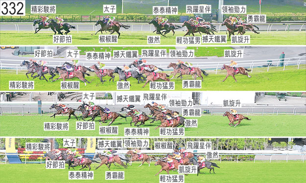 「凱旋升」周俊樂表示,他獲指示讓坐騎跟前競跑。他說,坐騎於早段未能展現足夠前速以遵從該等指示,他其後選擇收慢坐騎以佔取「輕功猛男」之後有遮擋的位置,以免坐騎在沒有遮擋下走外疊,但導致坐騎於接近九百米處時在一段途程上走勢欠順。他又說,坐騎在直路上衝刺僅屬一般。賽後立即接受獸醫檢查,並無發現任何明顯異常之處。 「椒椒醒」巴度表示,他於早段須略為催策坐騎以佔取領先馬匹之後有遮擋的位置。他說,坐騎在直路上對催策反應欠強勁,走勢令人失望。賽後立即接受獸醫檢查,並無發現任何明顯異常之處。 「飛躍星伴」出閘僅屬一般。 「輕功猛男」起步後不久在收慢以嘗試取得遮擋之際走勢欠順。大部分途程在未能取得遮擋之際走外疊。 「傲然」起步後不久向內斜跑,與「精彩駿將」互相觸碰。 「領袖勁力」出閘笨拙及失地。 「太子」出閘僅屬一般,其後與「精彩駿將」雙雙斜跑,因而與該駒互相觸碰。 「精彩駿將」躍出時與「太子」雙雙斜跑,因而與該駒互相觸碰。跑了一段短途程後在與略為向內斜跑的「傲然」互相觸碰之際失去平衡。賽後須抽取樣本檢驗。 「泰泰精神」轉直路彎時一度受困而未能望空,其後於入直路時移至「椒椒醒」外側。蔡明紹於接近一百五十米處時跌掉馬鞭。 「好節拍」賽後須抽取樣本檢驗。