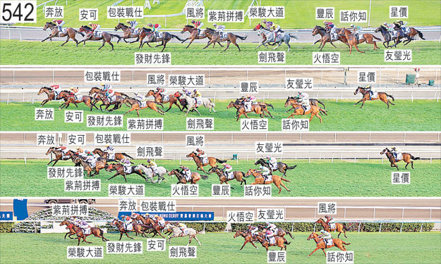 「話你知」自外檔出閘後於早段在馬群之後切入。自八百五十米處起在沒有遮擋下走外疊。麥文堅表示,坐騎居馬群後列,其後在直路上自該處起衝刺乏力。賽後立即接受獸醫檢查,並無發現任何明顯異常之處。 「友瑩光」潘頓表示,坐騎出閘笨拙,因而失蹄及失地。他說,坐騎因而居馬群後列,直路上難以追前。賽後立即接受獸醫檢查,並無發現任何明顯異常之處。 「榮駿大道」賽後須抽取樣本檢驗。 「火悟空」霍宏聲報告,坐騎未能應付是賽的千八米途程。賽後立即接受獸醫檢查,並無發現任何明顯異常之處。 「星價」自外檔出閘後於早段在馬群之後切入。賽後立即接受獸醫檢查,並無發現任何明顯異常之處。 「包裝戰仕」躍出時失蹄。早段搶口。四百米處至五十米處之間在「奔放」與「安可」之間受困而未能望空。接近五十米處時推進至「奔放」與「安可」之間的窄位,自該處起衝刺良佳。 「安可」巴度表示,坐騎是日出閘迅速,因而居於較賽前部署為前的位置。 「紫荊拼搏」賽後須抽取樣本檢驗。