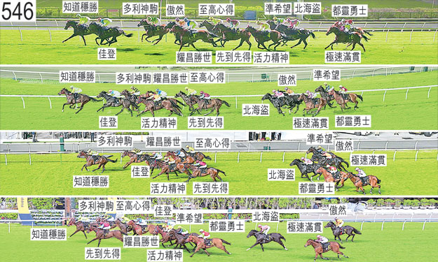 「佳登」躍出時發生碰撞。布文表示,他須於早段略為催策坐騎以上前。他說,坐騎在直路上衝刺時保持同速,末段在「活力精神」與「耀昌勝世」之間的窄位競跑之際收慢,當時「耀昌勝世」被「至高心得」略為帶向外跑,導致他未能力策坐騎至終點。賽後立即接受獸醫檢查,並無發現任何明顯異常之處。 「傲然」躍出時發生碰撞。梁家俊(「活力精神」)承認一項不小心策騎〔賽事規例第100(1)條〕,事緣他於接近五百米處時容許坐騎在尚未帶離「先到先得」下向內移入,導致「先到先得」被帶向內跑壓向「傲然」,「傲然」因而在失去跑線之際勒避。小組判罰梁家俊由四月十五日星期三開始停賽,直至四月二十日星期一才可再次出賽(兩個香港賽馬日)。在衡量判罰輕重時,小組裁定梁家俊的不小心策騎程度屬第二級,以及影響情況屬第二級,也考慮了他的良好策騎出賽紀錄。巫顯東表示,坐騎是日自有利檔位出閘及增程角逐,他獲指示讓坐騎居於較近仗為前的位置。 「知道穩勝」賽後須抽取樣本檢驗。 「活力精神」自七百米處起走外疊,沒有遮擋。梁家俊因於接近五百米處時造成干擾而承認一項不小心策騎(見「傲然」)。 「都靈勇士」自外檔出閘後於早段在馬群之後切入。 「北海盜」練馬師賀賢確認,他指示奧爾民讓自外檔出閘的此駒於早段留後競跑。 「準希望」起步時向內斜跑,與「佳登」互相觸碰,因而失去平衡。跑離五百米處時收慢避開勒避的「傲然」。五百米處至三百米處之間在「傲然」墮退時受困。賽後立即接受獸醫檢查,發現此駒有呼吸毛病,須接受進一步評估。 「先到先得」躍出時發生碰撞。接近五百米處時在被「活力精神」帶向內跑之際與「傲然」互相觸碰。賽後須抽取樣本檢驗。 「耀昌勝世」在沒有遮擋下走外疊直至接近七百米處。 「至高心得」離開亮相圈前觸碰欄杆,於起步點接受獸醫檢查,獸醫認為此駒適宜出賽。出閘僅屬一般。接近千三米處首次轉彎時在「先到先得」內側緊迫競跑,當時「先到先得」被「耀昌勝世」略為帶向內跑。