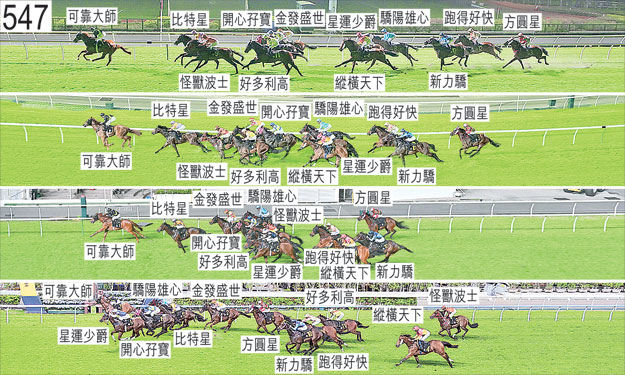 「開心孖寶」跑了一段短途程後與「金發盛世」雙雙斜跑,因而與該駒互相觸碰。跑離九百米處時向內斜跑及與「金發盛世」互相觸碰。 「金發盛世」跑了一段短途程後與「開心孖寶」雙雙斜跑,因而與該駒互相觸碰。跑離九百米處時被向內斜跑的「開心孖寶」碰撞。末段在雙雙略為斜跑的「比特星」與「驕陽雄心」之間緊迫競跑。霍宏聲表示,坐騎是晚走勢平平。 「方圓星」起步時發生碰撞。 「縱橫天下」接近五百米處時在收慢避開「好多利高」之際向外斜跑。賽後立即接受獸醫檢查,並無發現任何明顯異常之處。 「星運少爵」起步後不久向外斜跑及被碰撞。趨近三百米處時在移至「好多利高」外側以望空之際失蹄。賽後須抽取樣本檢驗。 「可靠大師」賽後須抽取樣本檢驗。 「驕陽雄心」出閘笨拙及失地。起步後不久在移至「新力驕」之後時緊貼該駒的後蹄處於窘境,因而失蹄。轉直路彎時在「金發盛世」之後受困。 「怪獸波士」起步後不久發生碰撞。梁家俊表示,坐騎於早段及中段沿途搶口,過了六百米處後轉彎時外閃。他又說,坐騎在直路上對催策毫無反應及墮退。賽後立即接受獸醫檢查,並無發現任何明顯異常之處。 「新力驕」出閘僅屬一般,其後不久在「怪獸波士」與「星運少爵」之間受擠迫時收慢,當時「星運少爵」向外斜跑避開「比特星」。班德禮表示,坐騎首次在跑馬地上陣,早段走勢僅屬一般,但他滿意坐騎在直路上的衝刺。賽後立即接受獸醫檢查,並無發現任何明顯異常之處。 「好多利高」接近六百米處時收慢避開外閃的「怪獸波士」。大部分途程走外疊,沒有遮擋。 「跑得好快」出閘笨拙,向外斜跑及與「方圓星」互相觸碰。三百米處至一百五十米處之間在移至「好多利高」外側之際難以望空。
