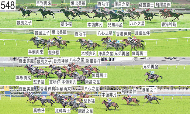 「本領非凡」躍出時被大力碰撞後軀,因而失去平衡。何澤堯表示,賽事早段及中段步速較標準時間為快,坐騎陣上走勢欠佳。他又說,負頂磅一百三十五磅上陣的坐騎在直路上衝刺僅屬一般。賽後立即接受獸醫檢查,並無發現任何明顯異常之處。 「暴風之子」跑了一段短途程後發生碰撞。被查詢時,奧爾民表示,他獲指示讓坐騎上前,但盡可能取得遮擋。他說,坐騎出閘迅速,他其後於早段須讓坐騎持續上前以超越「兄弟再盈」及「堅多福」,坐騎因而居領放馬「手到再來」外側。他又說,趨近千一米處時,正在搶口的坐騎推進並超越「手到再來」,當時該駒的騎師未有爭奪領先,他遂於進入對面直路後接近九百米處時選擇讓坐騎持續上前超越「手到再來」。被查詢是否有機會讓坐騎在「手到再來」外側保持位置避免以更快步速領放時,奧爾民表示,由於坐騎搶口,而且已推進及超越「手到再來」,他認為坐騎的最佳機會是繼續上前及超越該駒,而不是持續約束坐騎。他進一步表示,讓坐騎上前進佔領先位置後,他在賽事中段沿途能夠減慢步速,以嘗試協助坐騎在直路上以勁勢衝刺,但坐騎對催策毫無反應。練馬師徐雨石確認他屬意讓此駒取得遮擋。賽後立即接受獸醫檢查,內窺鏡檢查顯示此駒的氣管內有很多血。「暴風之子」必須通過獸醫檢驗後,才可再次出賽。 「飛躍星伴」自外檔出閘後於早段在馬群之後切入。 「香港神駒」自大外檔出閘後於早段在馬群之後切入。 「爆出美麗」布文表示,他賽前打算讓自內檔出閘的坐騎佔取較近仗為前的位置。他說,他因而於早段催策坐騎,坐騎展現的前速較他預期為快,能夠居於前列位置。練馬師告東尼確認,策騎指示是讓此駒佔取更為靠前的位置,以把握排內檔的優勢。賽後須抽取樣本檢驗。 「兄弟再盈」跑了一段短途程後發生碰撞。大部分途程在沒有遮擋下走外疊。包尾大敗而回,小組認為此駒的表現難以接受。「兄弟再盈」必須試閘及格,並且通過獸醫檢驗後,才可再次出賽。賽後立即接受獸醫檢查,並無發現任何明顯異常之處。 「八心之星」出閘僅屬一般,其後在受急促向內斜跑的「真叻仔」擠迫之際勒避。 「真叻仔」躍出時急促向內斜跑,因而與「八心之星」及「本領非凡」大力觸碰,嚴重失去平衡。賽後須抽取樣本檢驗。 「手到再來」在跑馬地馬房內校正右後蹄的蹄鐵,其後接受獸醫檢查,獸醫認為此駒適宜出賽。 「堅多福」自六百米處起須在沒有遮擋下走外疊。賽後須抽取樣本檢驗。