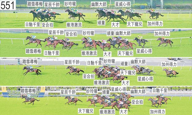 「踏雪尋梅」賽後須抽取樣本檢驗。 「日馳千里」跑了一段短途程後在「至合拍」內側緊迫競跑時與「星辰千帥」互相觸碰。艾兆禮表示,坐騎出閘僅屬一般,他其後須於早段催策坐騎上前以遵從策騎指示。他說,坐騎於早段走外疊,他須持續催策坐騎以佔取領放馬外側的位置,坐騎因而在直路上衝刺乏力。賽後立即接受獸醫檢查,並無發現任何明顯異常之處。小組認為與上仗相比,「日馳千里」今仗的表現令人失望。「日馳千里」必須試閘及格,並且通過獸醫檢驗後,才可再次出賽。 「星威心得」起步時發生碰撞。 「至合拍」布文表示,他未有獲發具體的策騎指示。他說,坐騎出閘迅速,他選擇讓坐騎上前,但須於早段消耗坐騎太多力氣,導致坐騎在直路上未能以勁勢衝刺。賽後立即接受獸醫檢查,並無發現任何明顯異常之處。 「大才」大部分途程走外疊,沒有遮擋。麥文堅因於接近一百五十米處舉鞭時一次將手抬高於肩部水平而被警告。 「頑童」接近千一米處時在收慢以讓「星辰千帥」過頭之際一度受該駒擠迫,當時「星辰千帥」在「日馳千里」內側緊迫競跑,「日馳千里」則相應被「至合拍」略為帶向內跑,而儘管騎師已努力阻止,但「至合拍」仍向內斜跑避開「踏雪尋梅」。 「星辰千帥」跑了一段短途程後發生碰撞。奧爾民表示,坐騎首次佩戴眼罩上陣,他獲指示讓坐騎上前,並採取與三月十四日坐騎在佩戴眼罩下首名完成跑馬地試閘時相若的騎法。賽後須抽取樣本檢驗。 「天下寵兒」出閘笨拙。三百米處至一百五十米處之間在推進至「日馳千里」與「至合拍」之間的窄位之際難以望空。練馬師廖康銘確認,策騎指示是讓自大外檔出閘的此駒於早段留後競跑。 「加州得力」賽後立即接受獸醫檢查,並無發現任何明顯異常之處。 「幽默大師」起步時發生碰撞。末段在向內斜跑的「星威心得」(霍宏聲)內側緊迫競跑。小組告誡霍宏聲須加倍小心。