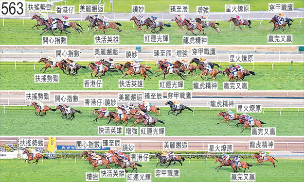 「增強」自外檔出閘後於早段在馬群之後切入。過了三百米處後在一段短途程上在「快活英雄」與「紅運光輝」之間推進之際難以望空。在此宗事件中,此駒與「紅運光輝」互相觸碰。賽後須抽取樣本檢驗。 「扶搖勢勁」賽後須抽取樣本檢驗。 「快活英雄」接近四百米處時發生碰撞。 「臻至辰」起步後不久與「美麗邂逅」互相觸碰。跑離一千米處時在雙雙略為斜跑的「紅運光輝」與「蹺妙」之間緊迫競跑之際收慢。 「贏完又贏」自大外檔出閘後於早段在馬群之後切入。 「紅運光輝」起步後不久被碰撞。趨近三百五十米處時在移至「快活英雄」外側之際內閃,因而不願移至該駒外側。過了三百米處後發生碰撞。 「星火燎原」出閘僅屬一般,其後不久在「快活英雄」內側緊迫競跑。接近六百五十米處時收慢避開「增強」。趨近四百米處時嘗試推進至「龍虎精神」外側,而該處空位不足以這樣做,因此與「贏完又贏」互相觸碰,導致「贏完又贏」失去平衡。小組告誡巫顯東須加倍小心。 「香港仔」早段在收慢以讓「開心指數」切入之際搶口。 「龍虎精神」大部分途程在沒有遮擋下走外疊。 「美麗邂逅」起步後不久向外斜跑,被碰撞。跑過一百米處時墮退,在受「蹺妙」(蔡明紹)擠迫之際收慢,當時「蹺妙」在尚未帶離下向內移入。小組譴責蔡明紹。 「穿甲戰鷹」自外檔出閘後於早段在馬群之後切入時走勢欠順。過了六百米處後推進至「星火燎原」內側,其後在「星火燎原」內側緊迫競跑之際失去平衡,當時「星火燎原」在被「贏完又贏」略為帶向內跑後向內斜跑避開該駒。接近二百米處時在略為向內斜跑的「臻至辰」內側未能望空之際收慢。田泰安表示,坐騎於接近二百米處時收慢,其後衝刺一般。賽後立即接受獸醫檢查,並無發現任何明顯異常之處。 「蹺妙」接近四百米處時在嘗試於「香港仔」外側望空之際與「快活英雄」互相觸碰,因而於其後在一段短途程上難以望空。末段在靠近「開心指數」處於窘境之際未能被力策。